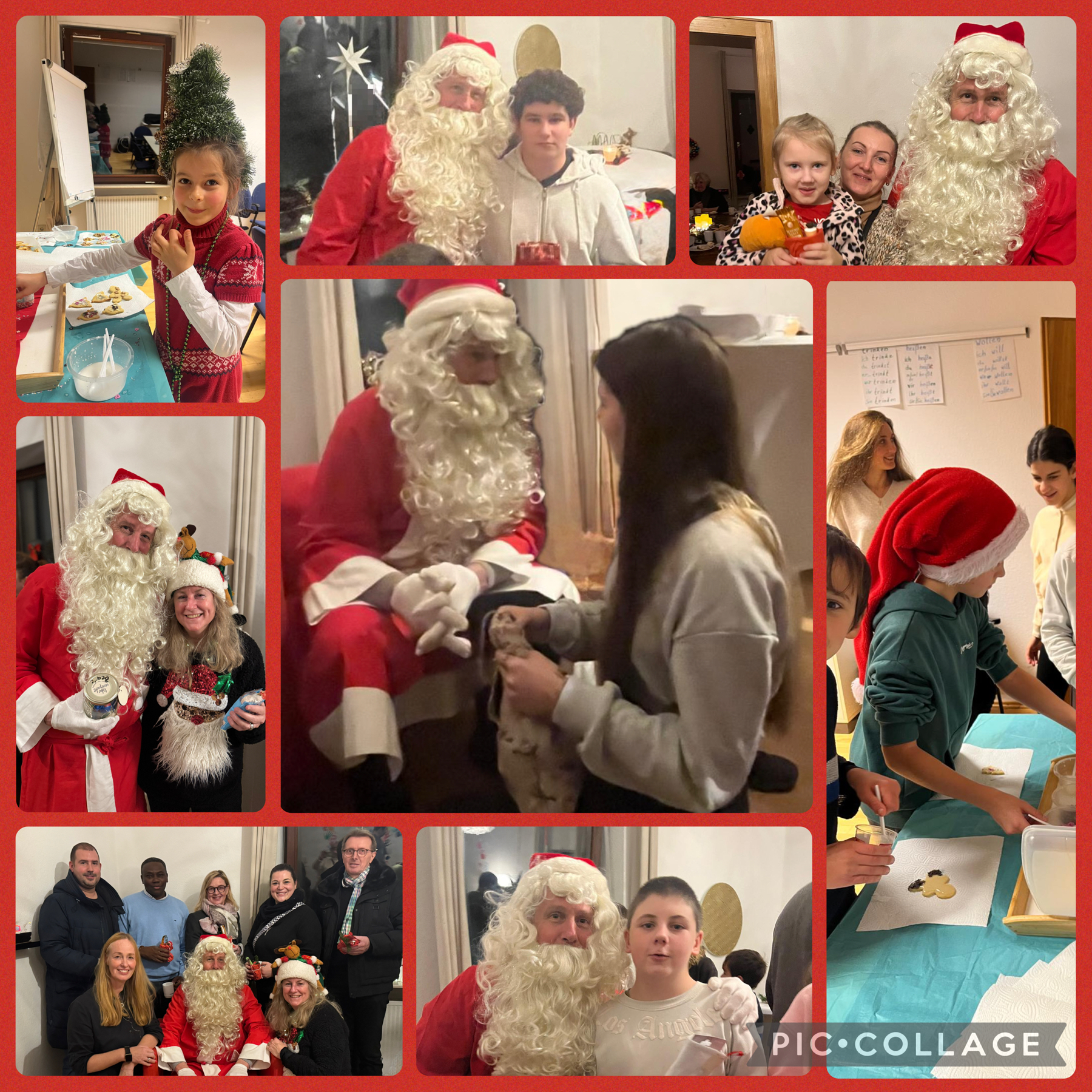 Überall leuchteten Lichterketten und die Tische waren hübsch mit Kerzen, Zuckerstangen und allerhand Basteleien geschmückt. Auf dem reichhaltigen Büffet reihte sich eine Köstlichkeit an die andere und mit Freude wurden neben Süßem auch Hotdogs verspeist. Im Obergeschoss konnte gebastelt und gesungen werden. Für jeden fand sich die passende Beschäftigung. Große Augen machten unsere Gäste, als mitten in das Geplauder ein lautes Ho, Ho, Ho durch den Flur erschallte. Der Nikolaus kam zu Besuch. Mit Hilfe von Elfe Iryna bekamen die zahlreichen Kinder gefüllte Strümpfe mit Süßigkeiten und je nach Alter einem Geschenkgutschein von Rossmann oder der Spielzeugkiste. Der gut gelaunte Nikolaus possierte für Fotos und machte sich dann wieder auf in die kalte Nacht und verschwand.